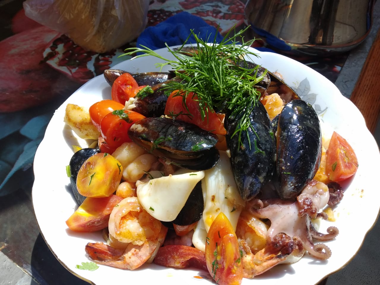 ассорти из морепродуктов: креветка, гребешок, кальмар, мини осьминог, мидии, лук, сельдерей